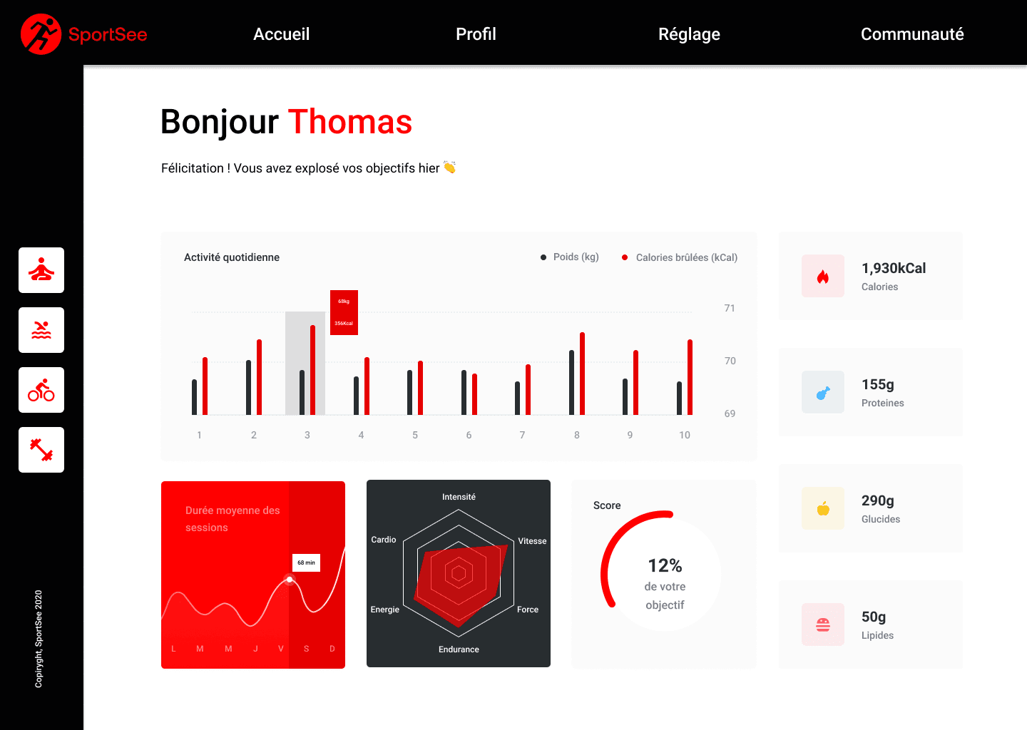 Développement d'un tableau de bord analytique, permettant aux utilisateurs de suivre leur activité sportive (séances réalisées, calories brûlées, poids, etc.).